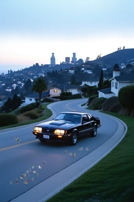 A car on a curved road of a peaceful back neighborhood of the city of Los