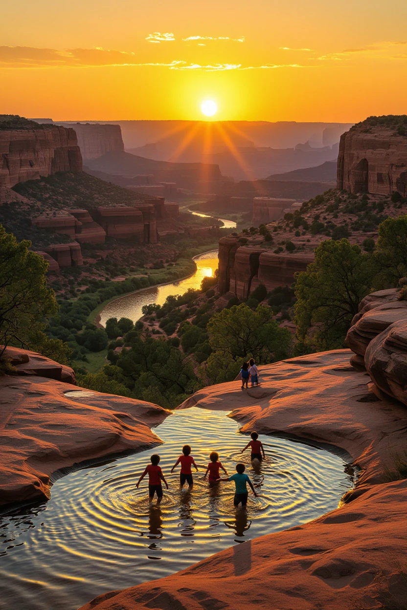 by Victor Adame Minguez, Akihiko Yoshida and Huang Guangjian, landscape of a The sun sets over the awe-inspiring canyon de Chelly, casting a warm orange glow on the rocks and trees below. A group of children playfully chase each other through the water, their laughter echoing through the air. In the distance, at Golden hour, Hopeless, Fast Shutter Speed, Fuji superi400, F/1.8, Technicolor