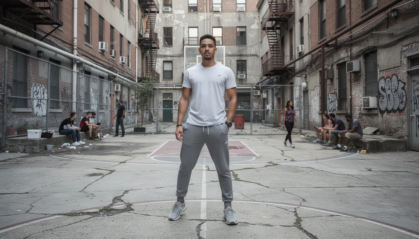 { "scene": "Urban courtyard basketball court surrounded by tall dilapidated apartment buildings with cracked concrete, fire escapes, and weathered facades", "subjects": [ { "type": "Main Subject", "description": "Young adult standing confidently in the center of the court, neutral modern outfit, clean silhouette, highly detailed face, clearly visible skin texture and fabric folds", "position": "center foreground dominating the frame", "action": "standing still and looking down toward the camera" }, { "type": "Environment Figures", "description": "A few scattered background people sitting on court edges and walking near the buildings, fully visible but clearly secondary", "position": "midground and background", "action": "sitting, leaning on fences, walking between buildings" } ], "style": "Modern digital photorealism, ultra-sharp detail across the entire image, natural colors, realistic imperfections", "lighting": "Natural daytime sunlight casting directional shadows from the buildings, soft ambient sky fill lighting", "mood": "Gritty, authentic, grounded, confident, urban realism", "background": "Chain-link fenced basketball court, concrete ground with worn paint lines, tall aging apartment towers rising on all sides, visible windows, balconies, and rooftop details", "composition": "Low-angle hero composition with the subject centered and towering buildings creating strong vertical framing behind", "camera": { "angle": "low angle looking upward from waist height", "lens": "35mm", "depth_of_field": "deep focus with full scene clarity from foreground to background", "camera_model": "Sony A7IV", "aspect_ratio": "16:9" } }