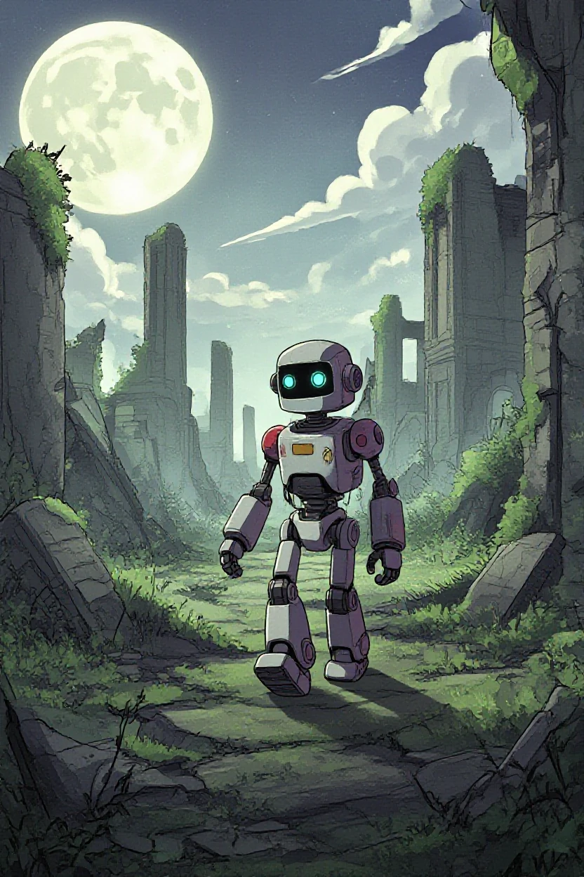 A friendly robot walking aimlessly on an abandoned planet, overgrown vegetation and the ruins of a once great civilization, anime style hand drawn image, intricate details, eerie atmosphere