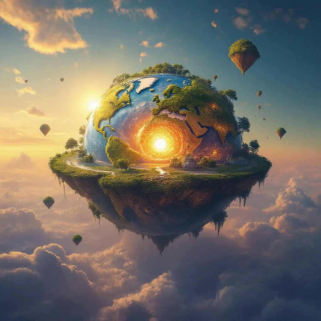 A sphere of floating islands orbiting a glowing sun core, ultra-quality, 8k