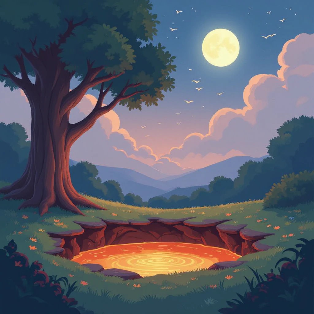 by Cory Loftis, Color splash, landscape of a serene landscape is bathed in the soft glow of the moon as the wind gently rustles through the leaves of a nearby tree. A lava pit sits in the center, its surface smooth and unblemished. Sunny, animation, character design, whimsical, expressive