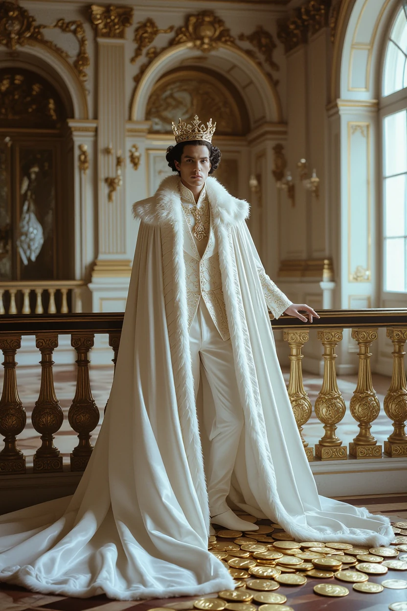 by karol bak, james jean and tom bagshaw, In a grand ballroom, a man in a flowing white gown and top of dress stands on the balcony with his black hair. He wears a royal crown and has two large round eyes. The room is decorated with gold coins and jewels, Land Art, Ambient lighting, F/14, Film Washi