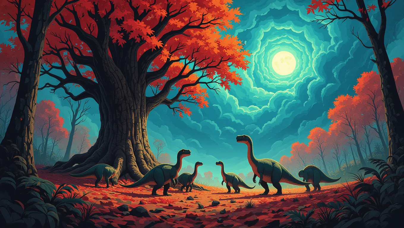 In the heart of a surreal landscape, a group of dinosaurs gather around a large tree. The ground is covered in thick leaves, and the trees are painted with vibrant hues of orange and red. As they move, the sky turns a deep shade of blue, Hurricane, sci-fi art, stylized by Les Edwards, Santiago Caruso, Horror art, dark fantasy, book covers, atmospheric scenes, macabre imagery, dark fantasy art, horror illustration, detailed linework, macabre imagery