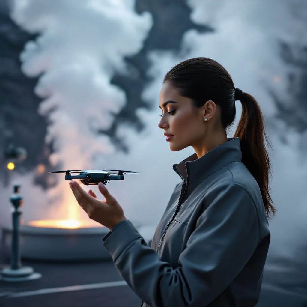 Portrait of a late-20s woman with a streamlined, modern aesthetic—slicked-back hair, lightweight graphite-gray jacket, minimal metallic accents. Soft rim lighting defines her profile, with crisp, editorial contrast throughout. Setting: a high-altitude geothermal platform surrounded by billowing steam vents—matte basalt flooring, modular sensor pylons, faint amber glows from embedded heat monitors. Action: calibrating a palm-sized thermal-mapping drone hovering at eye level, her hand guiding its orientation as real-time topographic patterns shimmer across its surface. Tone: precise, composed, futuristic, and visually immaculate.