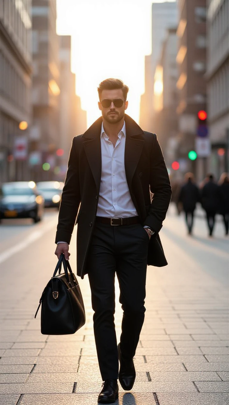 Street fashion shot, stylish man walking through city at sunset, lens flare, ultra-realistic, high quality, 8k photograph