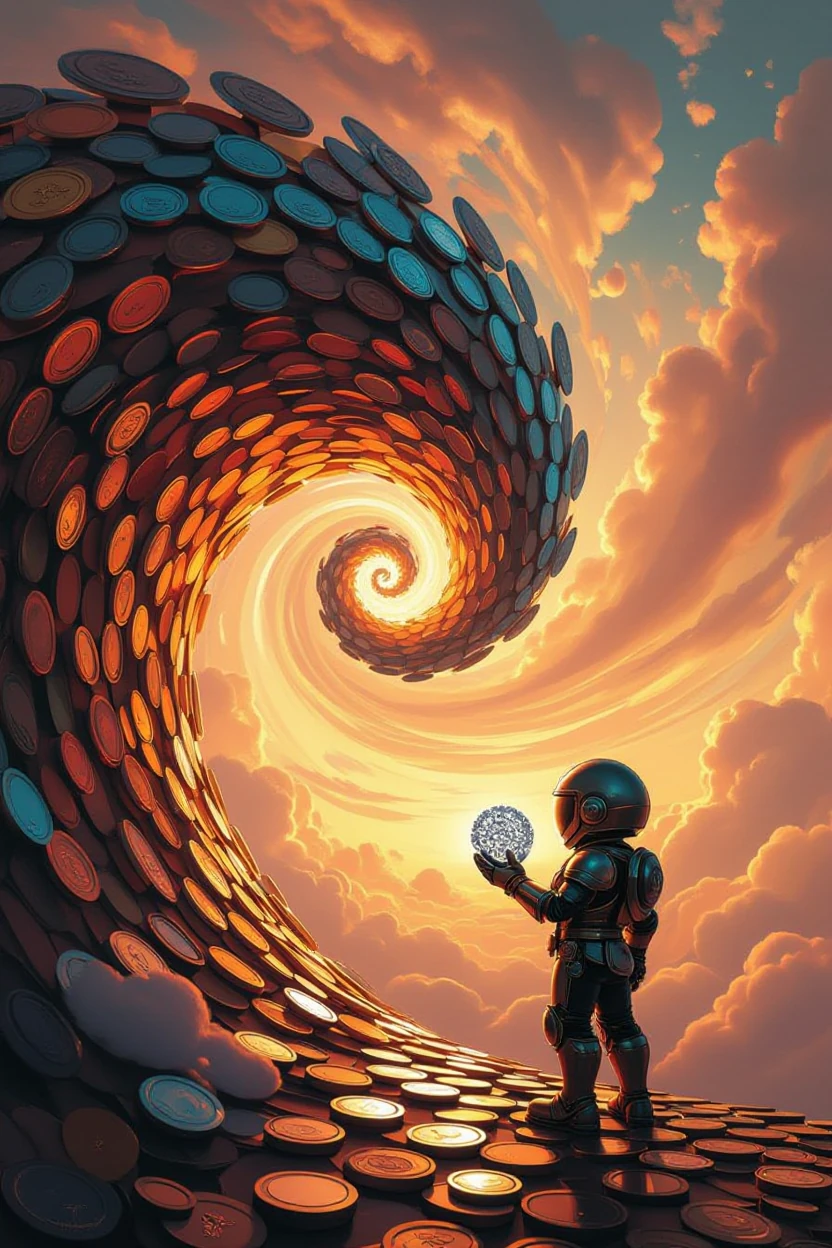 Super Mario style, a swirling vortex of colors fills the canvas, with shades of orange and brown dominating the sky. A figure dressed in an armored suit stands at one end of the frame, his head tilted to reveal a small object made of shimmering silver coins. Bokeh, fantasy art by James Jean, dreamlike and mysterious, intricate inlay work, beautiful lighting, Assemblage, abstract sculpture, multicultural, exploring the subconscious, vibrant, cute, cartoony, reminiscent of Super Mario series